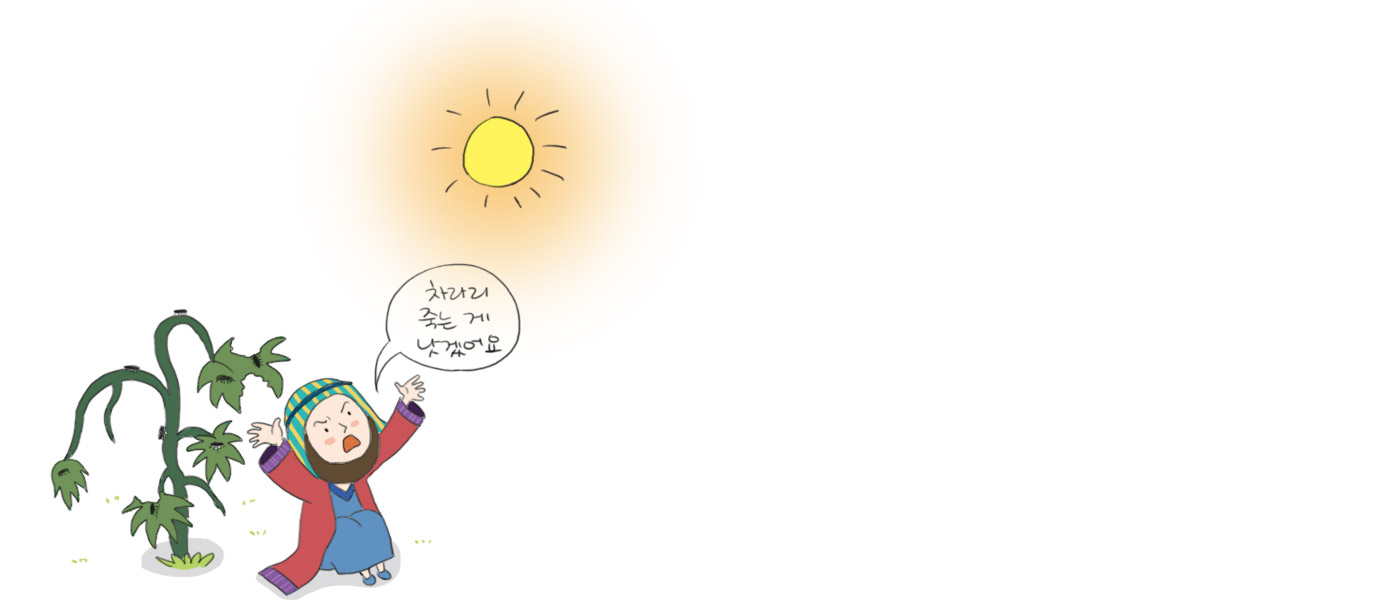 하나님께서는 요나 위로 박 넝쿨을 자라게 하여 그늘을 만들어주셨습니다. 그런데 다음 날에는 박 넝쿨을 벌레에 먹혀 시들어버리게 하셨습니다. 햇볕이 그대로 내리쬐고 뜨거운 동풍까지 불어오자 요나는 괴로워서 죽는 것이 낫겠다고 투덜거렸습니다.