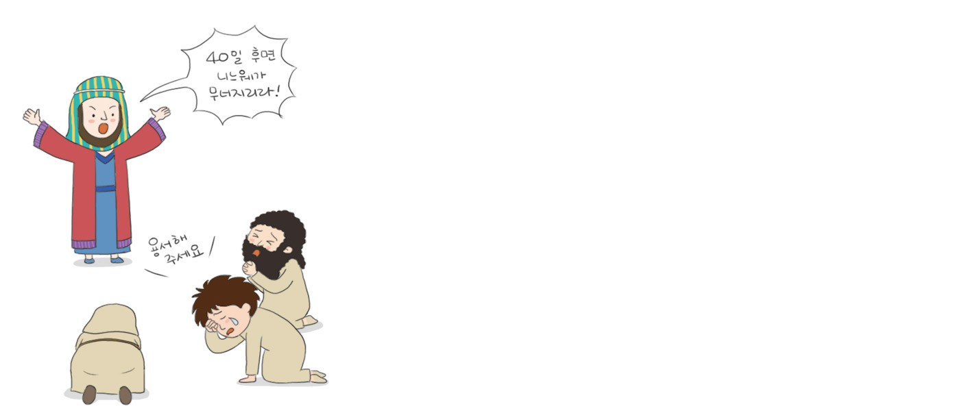 요나가 3일 동안 물고기 배 속에 있으면서 회개 기도를 드리자 물고기가 요나를 육지에 토해냈습니다. 하나님께서는 다시 요나를 니느웨 성으로 보내셨습니다. 요나는 하나님의 말씀대로 니느웨에서 “40일 후 니느웨가 무너지리라”고 외쳤습니다.