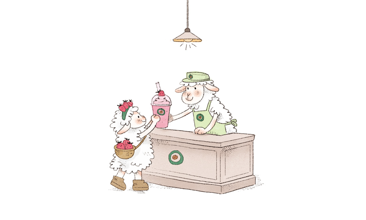 “딸기 소녀를 위한 딸기주스 나왔습니다. 딸기 소녀여서 딸기 많이 넣었어요. 이모의 넘치는 애정만큼 넣었으니깐 흘리지 않게 두 손으로 꼬옥 잡고 가요!”