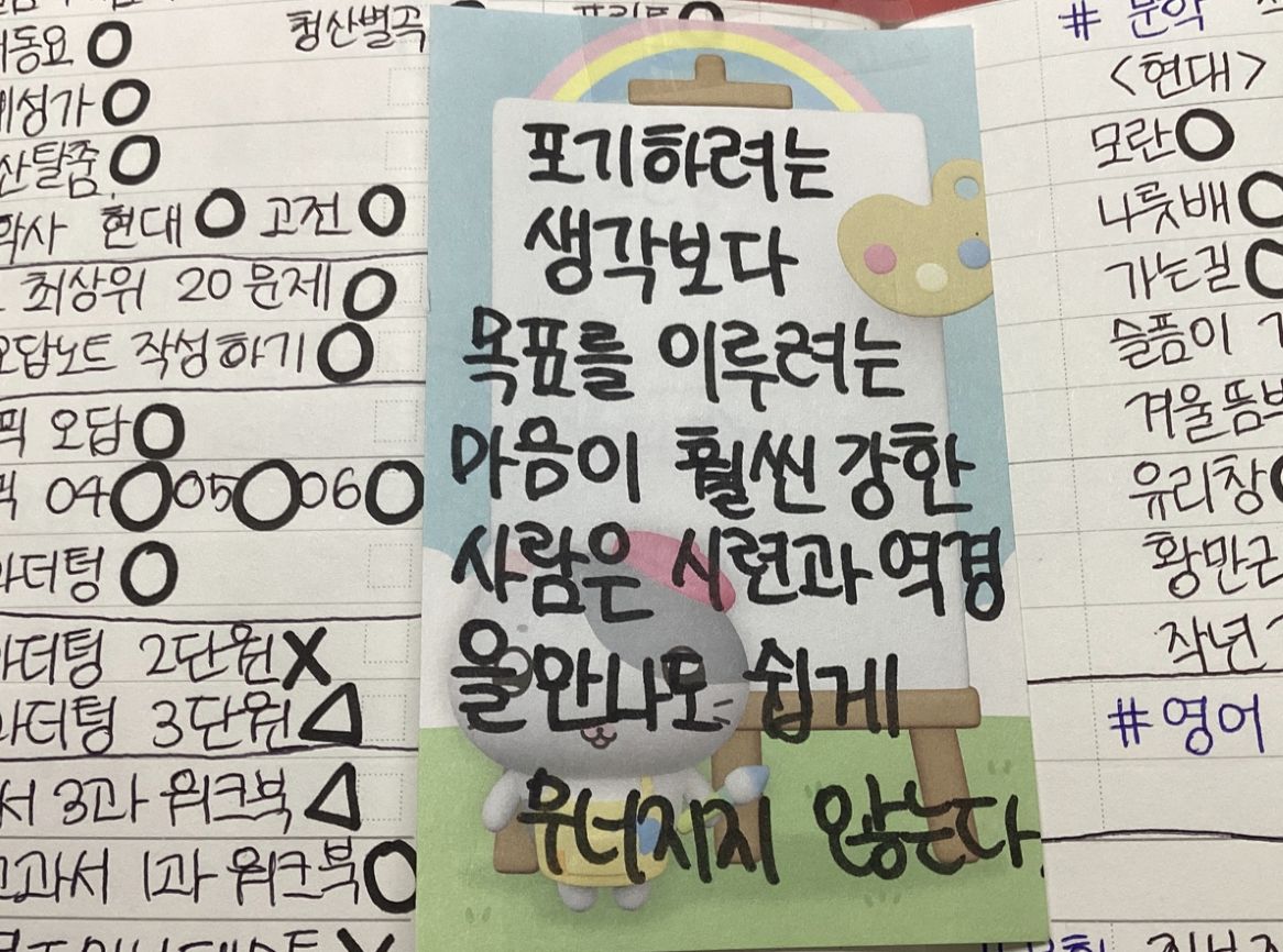 응원해 주었습니다. 친구는 문구가 마음에 들었는지 메모지에 문구를 옮겨 적더라고요.