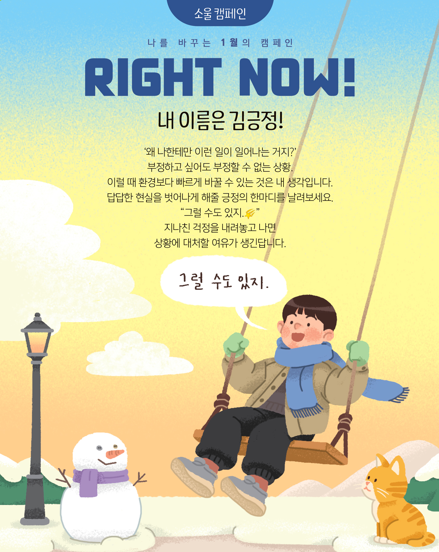 새해가 되면서 새로운 시작에 대한 두려움, 또 작년 한 해 동안 이루지 못했던 일들이 생각나면서 조금은 부정적인 생각을 했습니다. 하지만 이번 캠페인을 통해 긍정적으로 생각해 보기로 했습니다.“괜찮아, 별일 아니야”라며 스스로 다독인 결과 진짜 별일 아니었던 것처럼 모든 일이 술술 잘 풀렸습니다! 답답한 현실에서 벗어나 긍정적으로 생각하게 되었습니다!