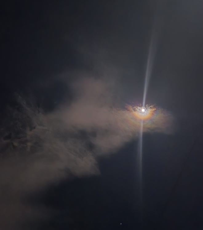 집 가는 길에 하늘을 봤습니다. 달빛에 무지개가 만들어져 있었습니다.