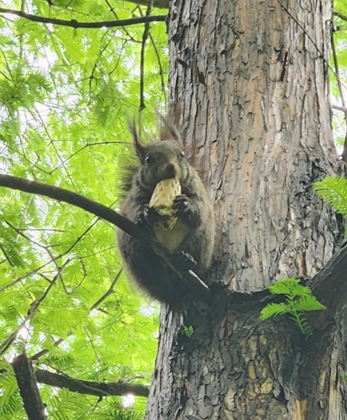 청설모가 나무 위에서 신나게 아이스크림을 먹고 있습니다.